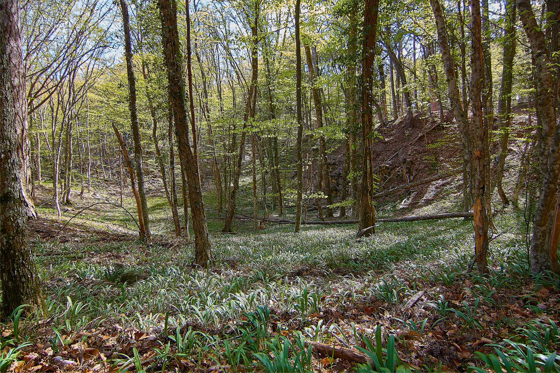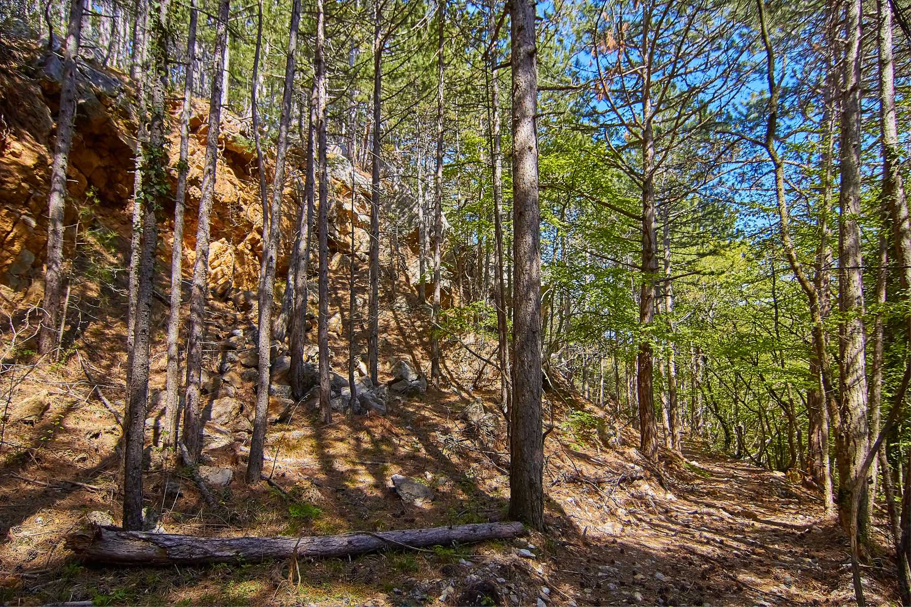 Этот лес очень хорош, густая тень, небольшой перепад высоты, преодолеть пешком или в седле его будет не трудно. Пение птиц, тенек на всем пути, не заросший полог леса позволяющий просматривать его на достаточно большое расстояние и отмечать разнообразие флоры, а порой даже и зазевавшихся животных и птиц. Пройдя около километра по аллее из шишек крымской сосны слева от дороги вы увидите живописное место, низина с поросшей аккуратной травой подстилкой упирающаяся в каменный выступ, утес метров 5-7 высотой. Еще немного после него, вы почувствуете что дорога начинает уходить немного вниз и вправо, как бы описывая вершину вокруг по часовой стрелке.