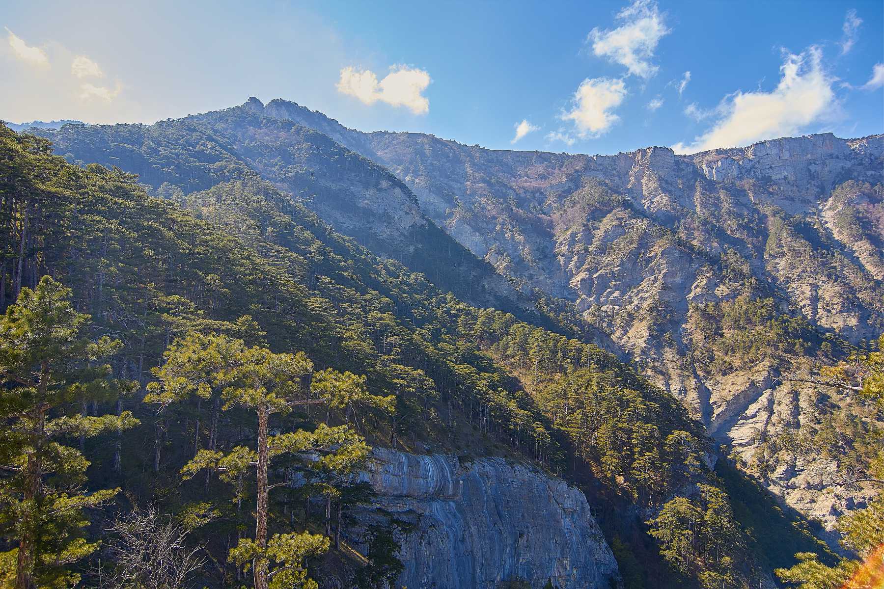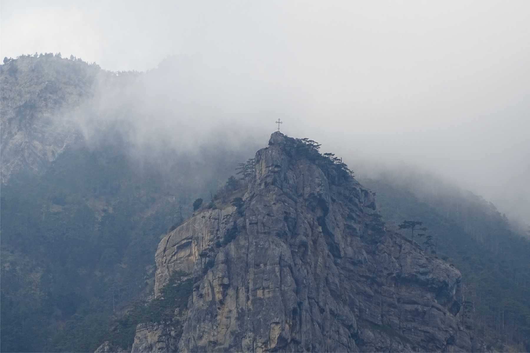 Вот из склона выпучил пузо каменный утес, высокий, отвесный, буквально навалился на тропку и мы его уважительно обходим, ощущая рукой тысячелетний холод камня. Крутой но короткий подъем, благо есть поручень и вы на очередной видовой площадке, там корни изобразили высокие и плавные дуги среди камней, самое место присесть на них, оценить величие гор и маленькую Ялту под ними. Особенно впечатляет редкий кедр, поросший в совершенно немыслимых местах, в узких расщелинах на отвесных стенах скал. Их форма вдохновляет. Тропинка делает еще пару пируэтов и снова выступ, нависший над тропой и снова видовая площадка. Далее Ялта оказывается по левую руку внизу, под горой, а пред вами последний отрезок серпантина. Вы идете по узкому выступу, вырубленному в почти отвесной скале и уже видите Ставри-Каю среди деревьев.