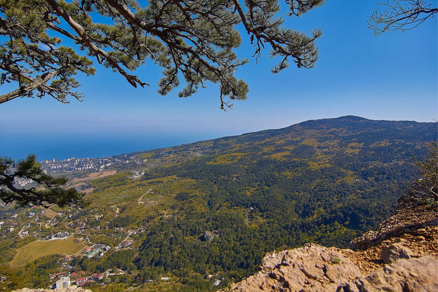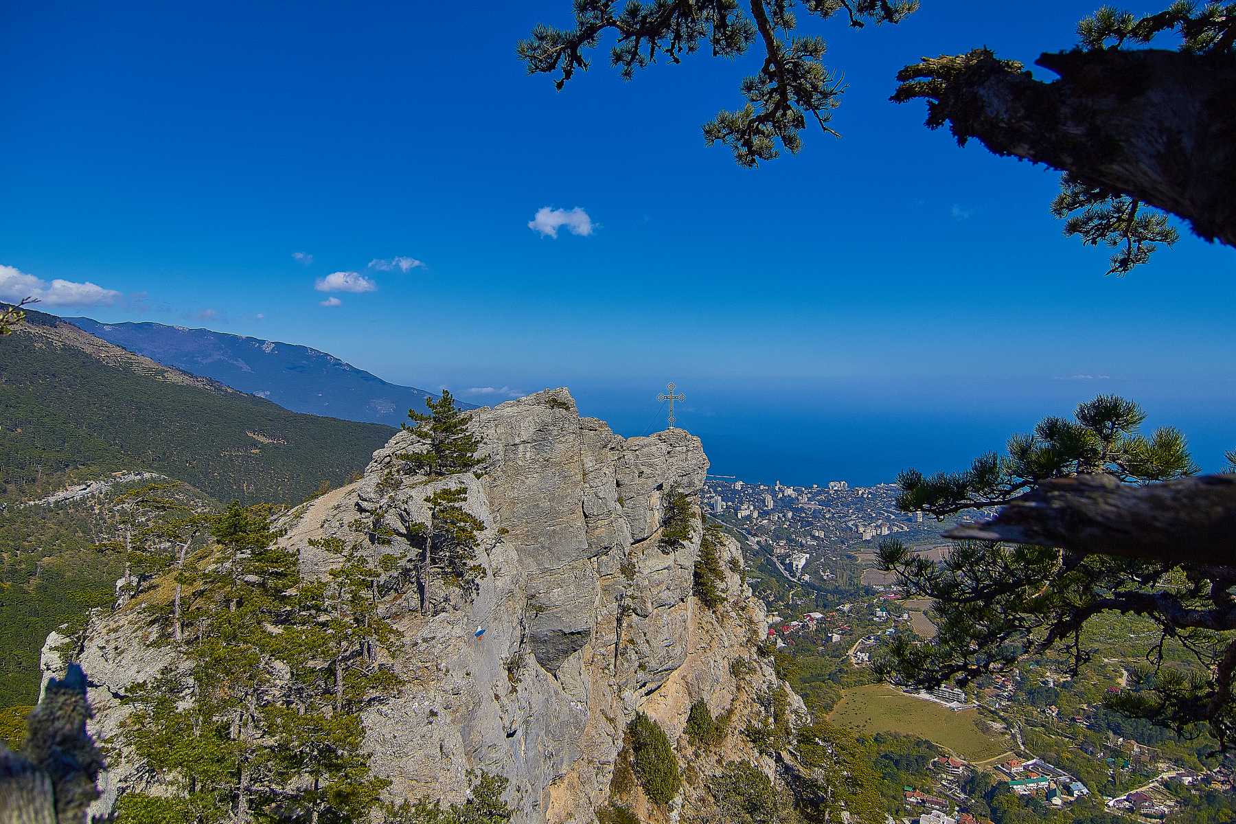 От креста, вид на Ялту захватывает, спирает дыхание, но уходить не хочется. Расчехляем фотики и делаем то за чем сюда пришли. Но только места оставьте, ведь нужно еще вернуться на площадку над скалой. Там растет живописная сосна, изящно гнутая ветрами и ни за что не желающая сдаваться. В этом месте прекрасно буквально все. Вид на море поверх густого леса и гор Могаби, крутой обрыв, за который можно тоже заглянуть если лечь на землю и аккуратно подползти к краю обрыва. Именно здесь берет свое начало Штангеевская тропа, что ведет к верхней точке водопада Учан-Су и так называемая Ставрикайская тропа (на самом деле верхний участок Штангеевки) она ведет на плато, вершину Ай-Петринской яйлы. Туда же на плато, есть еще одна тропа — Таракташская, она начинается примерно на 1/4 пути по Штангеевке. Что интересно, Могаби на 141 метр выше Ставри-Кая, но от сюда, кажется что она значительно ниже. Так же интересной особенностью является факт размещения в конце Штангеевской тропы (у водопада Учан-Су) информационного стенда, что это Боткинская тропа.