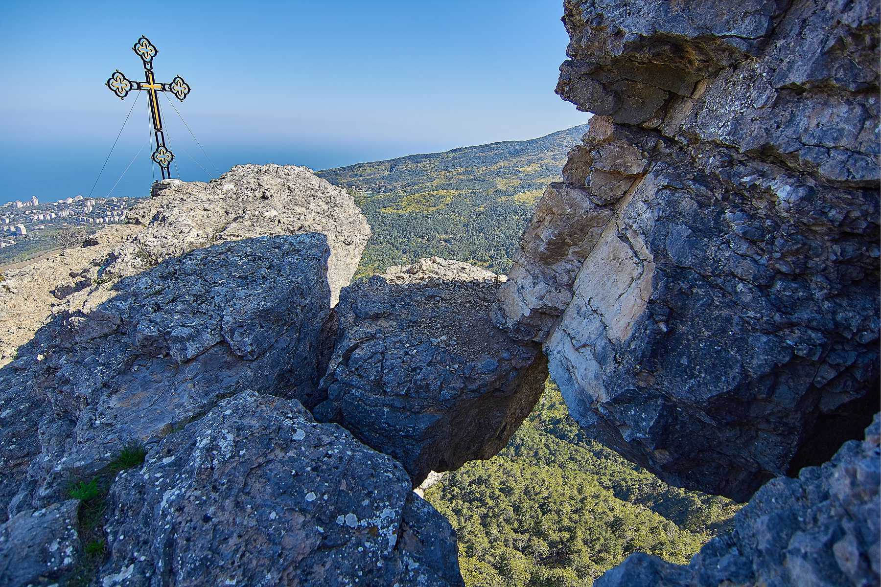 Тропинка разветвляется одна немного выше, другая чуть ниже. По нижней, пройдете прямиком к скале где можно подняться к самому кресту и головокружительным видам. По верхней доберетесь до видовой площадки, над скалой. Идем к кресту. Одна минута ходу, шаткая лестница о шести ступенях и мы у входа. Если нет сильного ветра, то добраться до креста не составит труда. Да и в ветер в общем то нет проблем, конечно бывают такие порывы что деревья сначала свистят, а потом ревут, а мелкие камушки сорванные ветром со скалы попадают по одежде. Но все же этой силы не хватит, что бы сдуть взрослого человека с поверхности, на которой есть за что ухватиться. Небольшой подъем по сыпучей мелким камушком тропинке и часть скалы висит в воздухе (справа), оперевшись на противоположный выступ разлома. Камень давно треснул, но не падает вниз, висит опершись. Под ним даже окно есть, можно заглянуть в пропасть и совсем не испугаться :-)