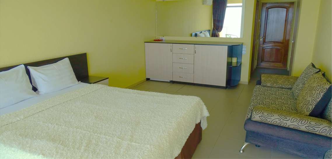 Здание отеля - не новое, но наш номер оказался обслуженным, хороший матрас, чистое и свежее белье, вся техника, в т.ч. окна и занавески - работают. Пляж прямо у входа, один минус - последние 100 метров до отеля, асфальт кончается и начинается гравийная дорога. Но, это мелочи, ведь вечером не так много машин, вообще практически нет, когда сидишь на балкончике - вечером нет пыли. Кафе - просто супер. Персонал, Наташа - СПАСИБО!