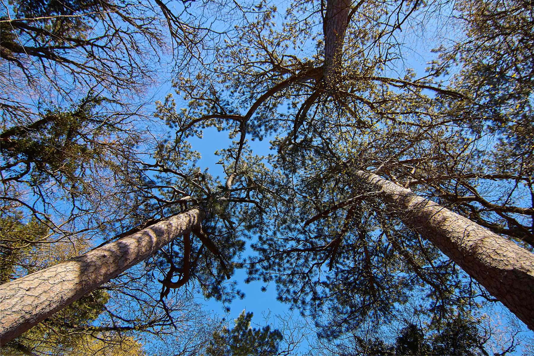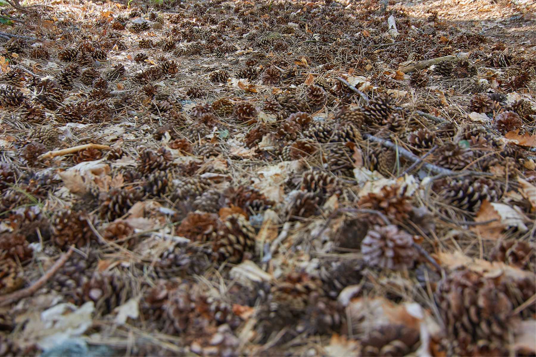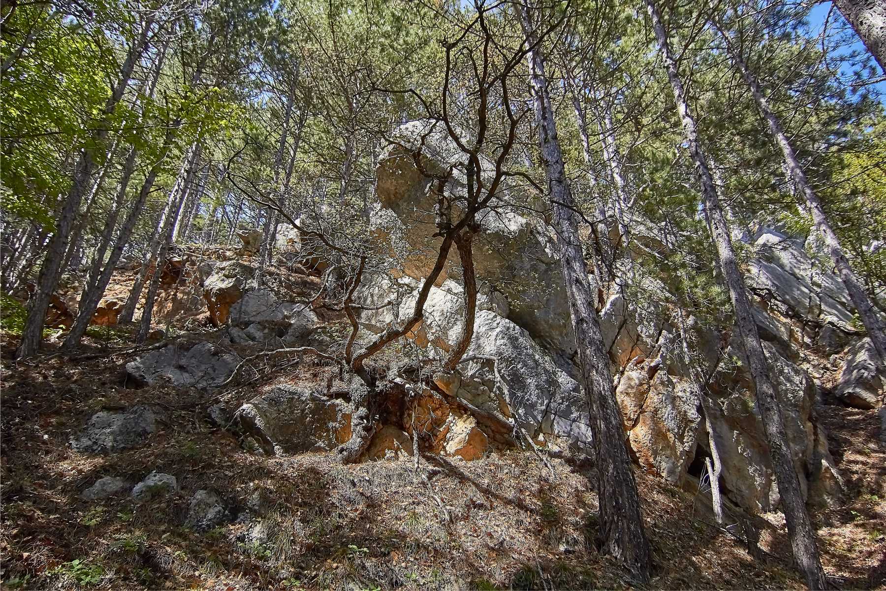 Этот лес очень хорош, густая тень, небольшой перепад высоты, преодолеть пешком или в седле его будет не трудно. Пение птиц, тенек на всем пути, не заросший полог леса позволяющий просматривать его на достаточно большое расстояние и отмечать разнообразие флоры, а порой даже и зазевавшихся животных и птиц. Пройдя около километра по аллее из шишек крымской сосны слева от дороги вы увидите живописное место, низина с поросшей аккуратной травой подстилкой упирающаяся в каменный выступ, утес метров 5-7 высотой. Еще немного после него, вы почувствуете что дорога начинает уходить немного вниз и вправо, как бы описывая вершину вокруг по часовой стрелке.