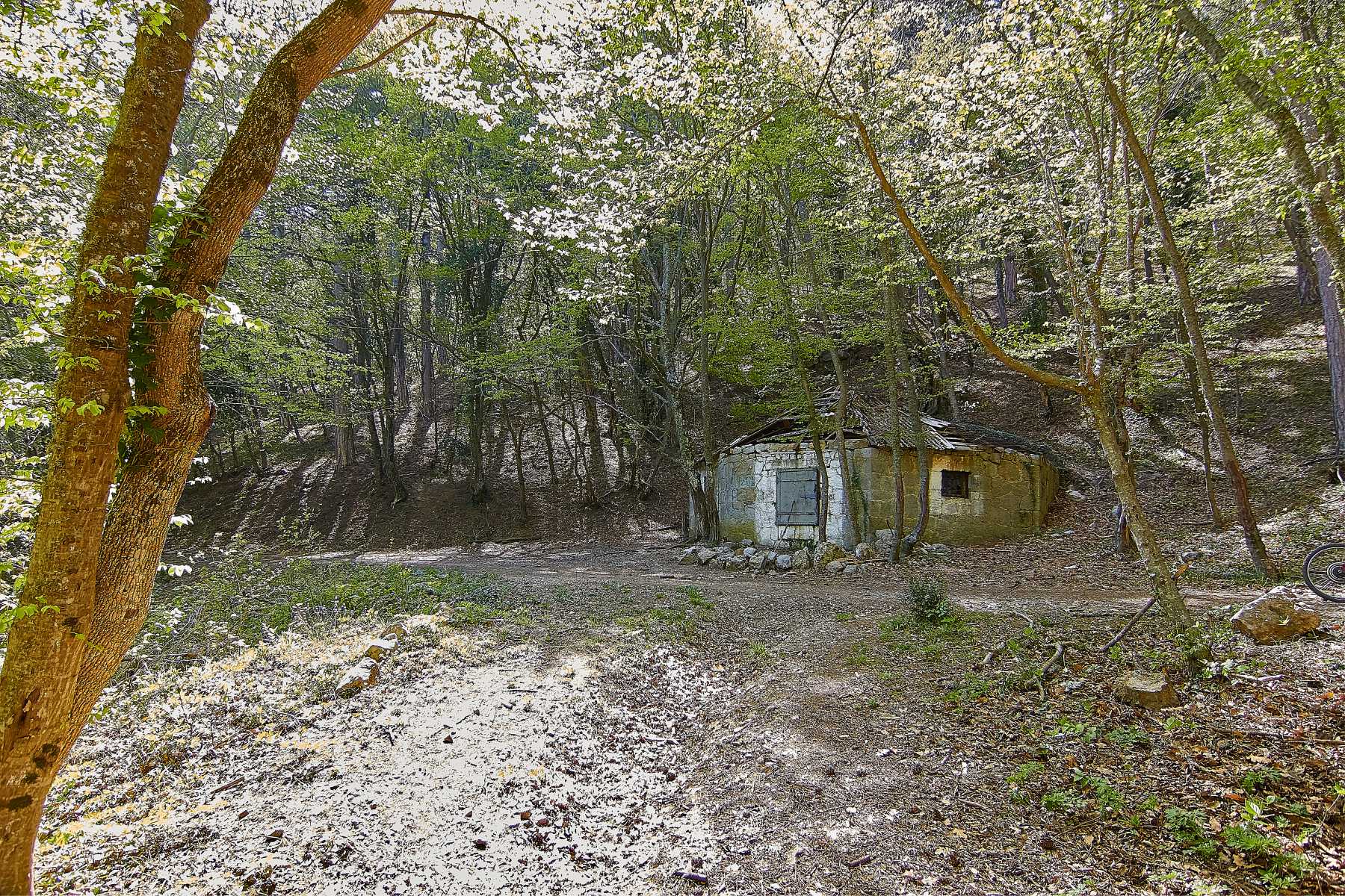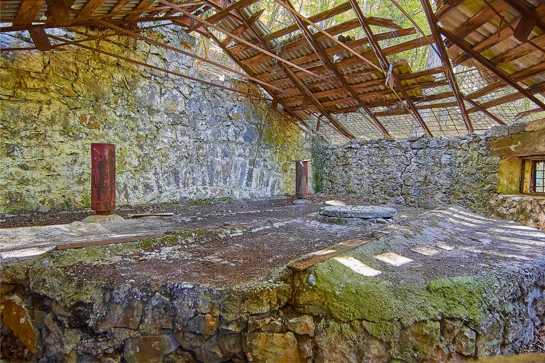 Минуя развилку к футбольному полю, двигаясь вверх по дорожкам, вы попадете к, на вид, заброшенному зданию со стенами из камня, местами поросшими ярко-зеленым мхом и с частично разрушенной крышей. По внешнему виду здания, сложно догадаться для чего оно построено и уж точно не понять, что в настоящее время и в таком состоянии оно еще выполняет свою функцию. Стены и крыша (когда она еще была) выполняют роль укрытия для подземной камеры, где соединяются трубы ведущие питьевую воду с горы в населенные пункты ЮБК. Да, здесь люди пьют воду из горных речек, причем в самой речке вода намного вкуснее того что идет из кранов, мы убедились в этом попробовав воду в нижнем Яузларском водопаде на реке Яузлар, когда гуляли по Боткинской тропе. В подножье Могаби имеются два питьевых озера, точнее пруда с Боткинской тропы их хорошо видно. Вода в них поступает для жителей Ялты от водопада Учан-Су и других, менее полноводных источников, не исключено что из того что мы здесь описали.
