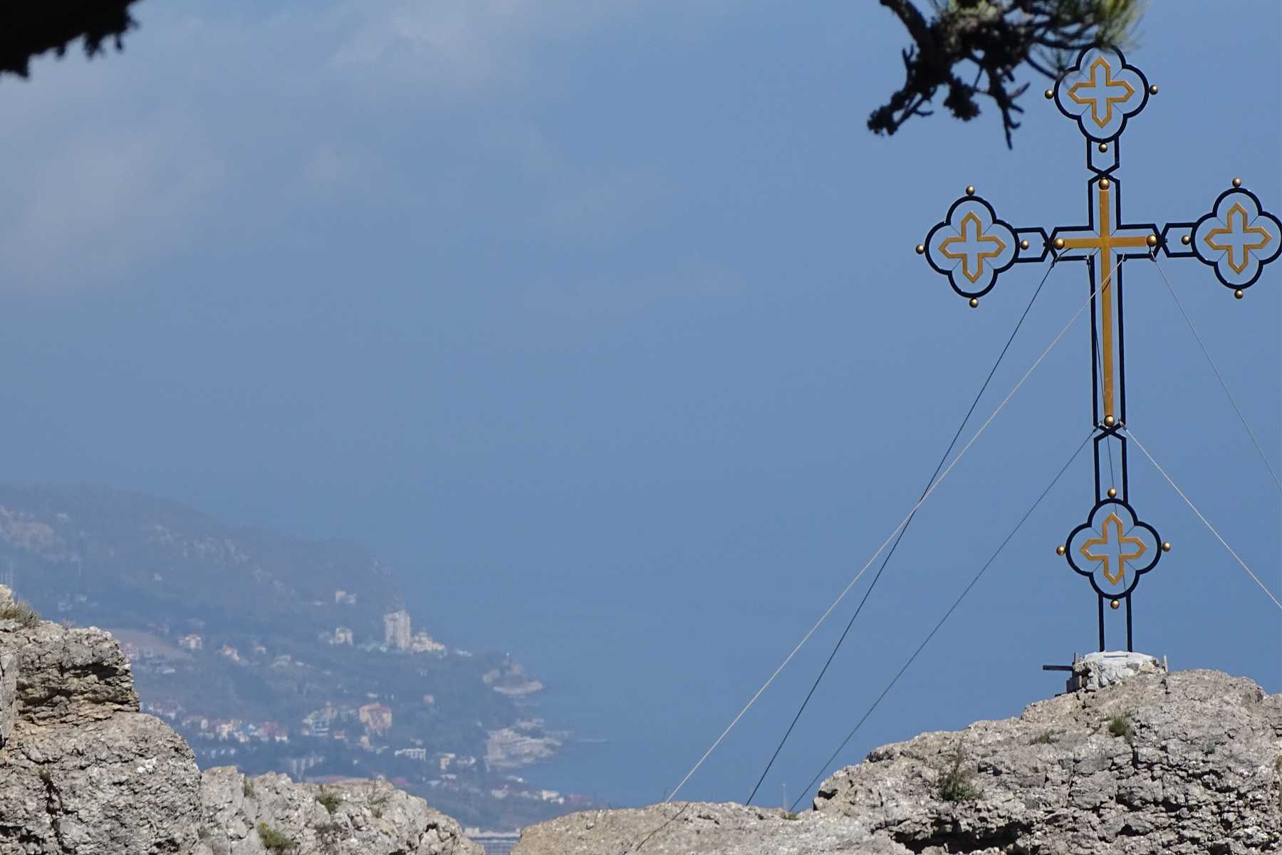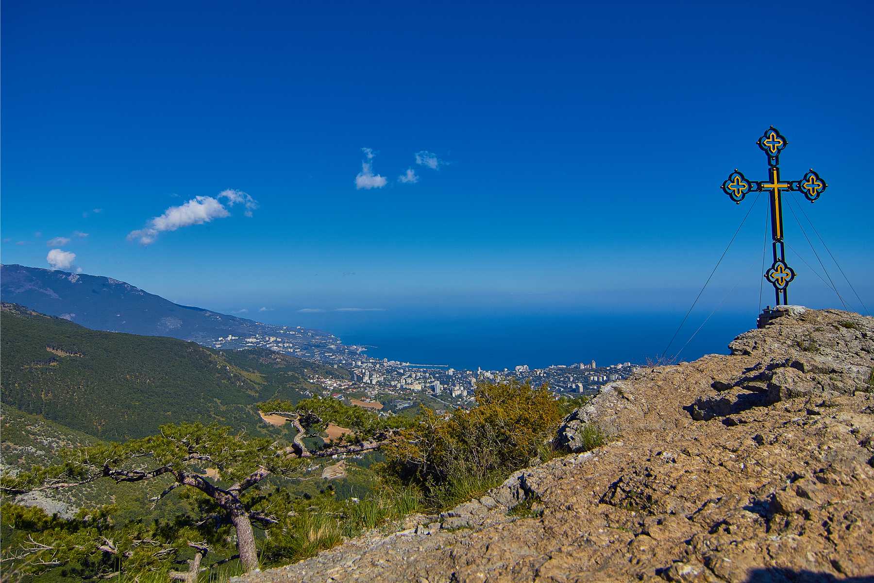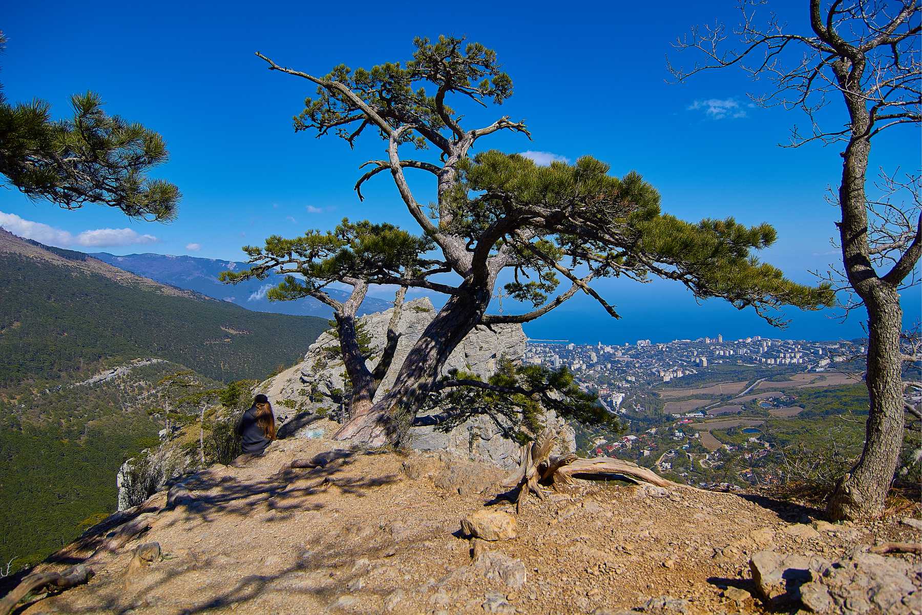От креста, вид на Ялту захватывает, спирает дыхание, но уходить не хочется. Расчехляем фотики и делаем то за чем сюда пришли. Но только места оставьте, ведь нужно еще вернуться на площадку над скалой. Там растет живописная сосна, изящно гнутая ветрами и ни за что не желающая сдаваться. В этом месте прекрасно буквально все. Вид на море поверх густого леса и гор Могаби, крутой обрыв, за который можно тоже заглянуть если лечь на землю и аккуратно подползти к краю обрыва. Именно здесь берет свое начало Штангеевская тропа, что ведет к верхней точке водопада Учан-Су и так называемая Ставрикайская тропа (на самом деле верхний участок Штангеевки) она ведет на плато, вершину Ай-Петринской яйлы. Туда же на плато, есть еще одна тропа — Таракташская, она начинается примерно на 1/4 пути по Штангеевке. Что интересно, Могаби на 141 метр выше Ставри-Кая, но от сюда, кажется что она значительно ниже. Так же интересной особенностью является факт размещения в конце Штангеевской тропы (у водопада Учан-Су) информационного стенда, что это Боткинская тропа.
